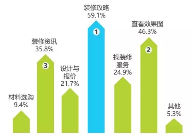 互聯(lián)網(wǎng)家裝用戶在線上使用的服務(wù)主要集中在查看裝修攻略、效果圖和獲取裝修咨詢這類參考信息型服務(wù),也逐漸涉及找裝修服務(wù)、涉及與報(bào)價(jià)、材料選購這樣的交易型服務(wù)。線上交易與線下裝修結(jié)合構(gòu)成互聯(lián)網(wǎng)家裝閉環(huán)。
