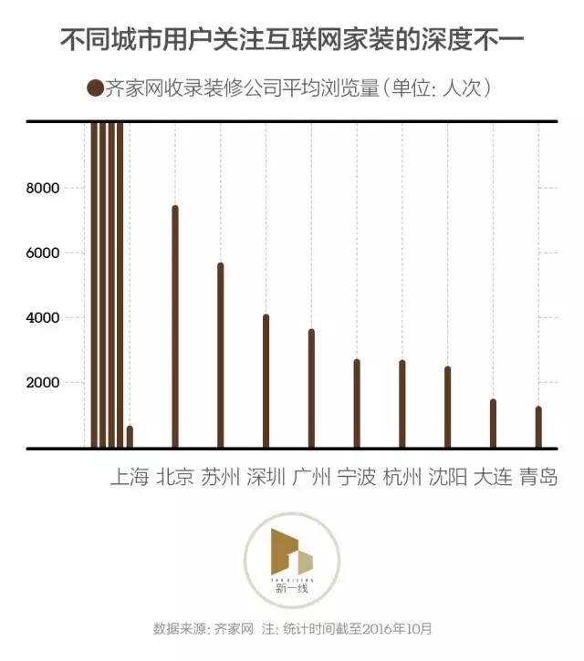 新一醬查看了齊家網(wǎng)上每家裝修公司的瀏覽人次,來判斷裝修用戶對于互聯(lián)網(wǎng)家裝的關注度。從這些數(shù)據(jù)看,上海用戶對于互聯(lián)網(wǎng)裝修的關注度最高——當然這也與上海是齊家網(wǎng)的大本營有關。