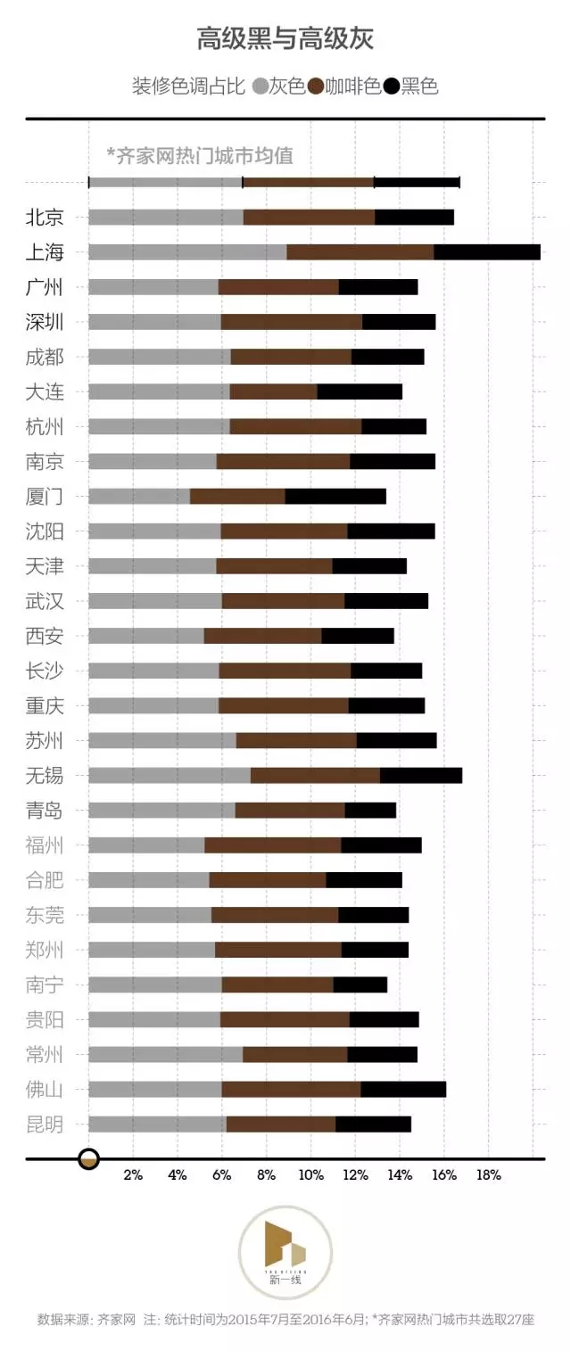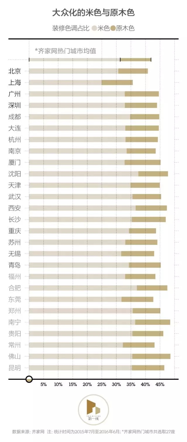 米色和原木色無疑是最大眾化的選擇,從27座齊家網(wǎng)熱門城市來看,超過三成的用戶選擇米色作為家裝主色調(diào),超過一成的用戶選擇了原木色。選擇黑、灰、棕這樣的小眾顏色的用戶比例就比較小了,選擇這三種顏色的用戶總和平均占比也僅為不到16%。在這兩類顏色中間,還有藍色、紫色、粉色、黃色等選項,以及比黑、灰、棕更為小眾的綠色和紅色。