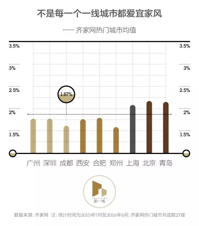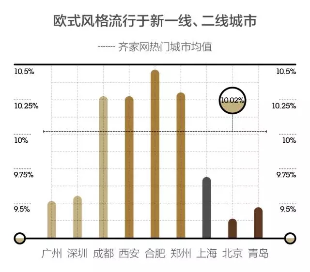 齊家網(wǎng)COO毛新勇發(fā)現(xiàn),不同城市對于家裝的價格定位、產(chǎn)品的風格需求不同?!吧綎|青島有一些德國德式的影子;威??拷毡?、韓國,并且來自這兩個國家的外籍人士比較多,所以威海日式、韓式的裝修風格更多。而上海消費升級的需求更多,使用進口材料的用戶多,也更青睞歐式、美式風格?!?/span>