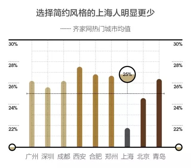 這里需要特別指出的是上海,它在裝修風格的偏好上與所有城市都不太一樣。上海選擇全國最主流的簡約風格的用戶比例最低,相較于其他城市,更大比例的上海用戶選擇了其他風格。