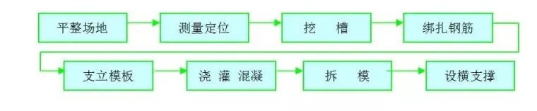 用全站儀放出地墻軸線,并放出導(dǎo)墻位置(連續(xù)墻軸線向基坑外側(cè)外放100mm),導(dǎo)墻開(kāi)挖采用小型挖掘機(jī)開(kāi)挖,人工配合清底?;缀粚?shí)后,鋪設(shè)7厘米厚1:3水泥沙漿,混凝土澆筑采用木模板及木支撐,插入式振搗器振搗。在導(dǎo)墻的混凝土達(dá)到設(shè)計(jì)強(qiáng)度前,禁止任何重型機(jī)械和運(yùn)輸設(shè)備在其旁邊通過(guò)。導(dǎo)墻施工縫與地下墻接縫錯(cuò)開(kāi)。其施工順序如下: