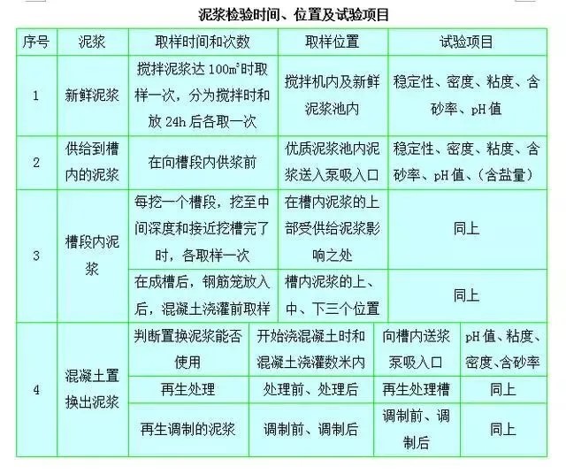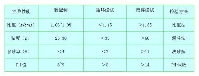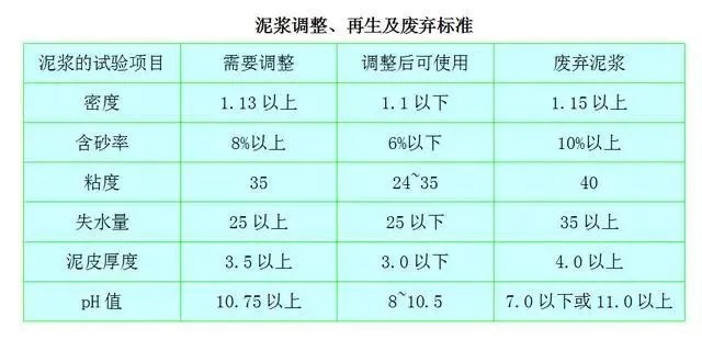 (3)混凝土置換出的泥漿,應(yīng)進(jìn)行凈化調(diào)整到需要的指標(biāo),與新鮮泥漿混合循環(huán)使用,不可調(diào)凈的泥漿排放到廢漿池,用泥漿罐車運(yùn)輸出場(chǎng)。泥漿調(diào)整、再生及廢棄標(biāo)準(zhǔn)見(jiàn)下表: