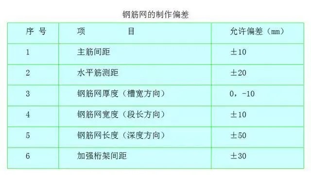 鋼筋籠采用整體制作、整體吊裝入槽,縮短工序時(shí)間。連續(xù)墻的鋼筋籠在現(xiàn)場(chǎng)整體制作。鋼筋籠按設(shè)計(jì)要求加工,1號(hào)線厚度為0.68m、長(zhǎng)度按墻長(zhǎng)加工27-36.3m,鋼筋采用的規(guī)格有Φ25、Φ20,2號(hào)線厚度為0.88m、長(zhǎng)度按墻長(zhǎng)加工26-41.7m,鋼筋采用的規(guī)格有Φ28、Φ20,鋼筋網(wǎng)鋼筋的連接方式采用雙面焊接,接頭位置相互錯(cuò)開(kāi),焊接接頭的位置、數(shù)量和焊接質(zhì)量按國(guó)家現(xiàn)行標(biāo)準(zhǔn)GB50201有關(guān)規(guī)定執(zhí)行,鋼筋網(wǎng)制作完成(含預(yù)埋件安裝)后由有關(guān)技術(shù)人員檢驗(yàn)合格后綁上標(biāo)簽。鋼筋網(wǎng)的制作必須符合下表規(guī)定。
