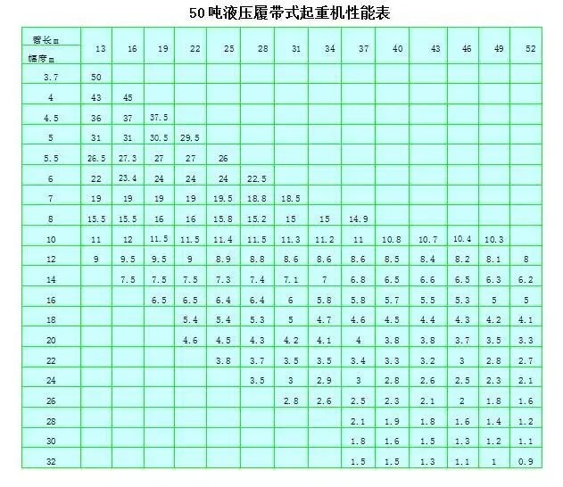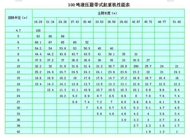 鋼筋籠采用整體吊裝,吊裝鋼筋籠選用一臺(tái)主吊機(jī)和一臺(tái)副吊機(jī)兩臺(tái)起重設(shè)備起吊,先水平吊起離開(kāi)地面,再緩慢、平穩(wěn)使之處于垂直狀態(tài),通過(guò)主吊車移動(dòng)、調(diào)整放入挖好的槽段中。本標(biāo)段最大的連續(xù)墻鋼筋籠尺寸為34m*6m*0.88m,重量為32.39t。根據(jù)現(xiàn)場(chǎng)條件,對(duì)照起重機(jī)性能表(見(jiàn)下圖),特選定100t履帶式吊機(jī)一臺(tái)(主),50T履帶式吊機(jī)一臺(tái)(副)。