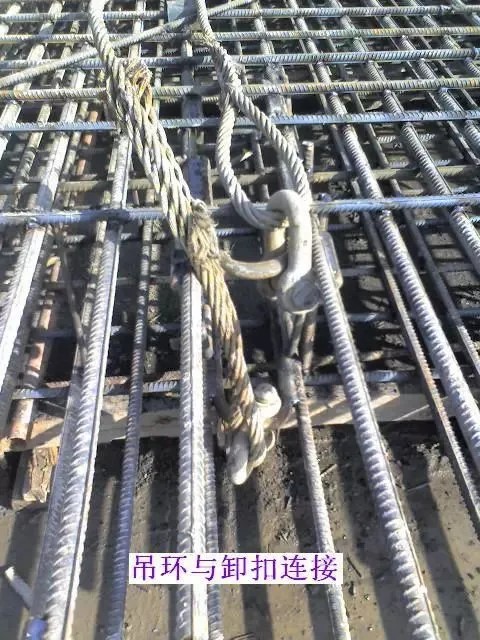由協(xié)助人員將主、副扁擔(dān)掛在相對(duì)應(yīng)的主、副吊機(jī)吊鉤上。待100t主吊機(jī)與50T副吊機(jī)就位后,檢查就位情況,確保正確就位。就位結(jié)束后,指揮吊機(jī)將扁擔(dān)緩緩落至鋼筋籠面層分布筋上面,然后由協(xié)助人員將扁擔(dān)上鋼絲繩用卸扣與吊環(huán)連接鎖緊。實(shí)物圖如下: