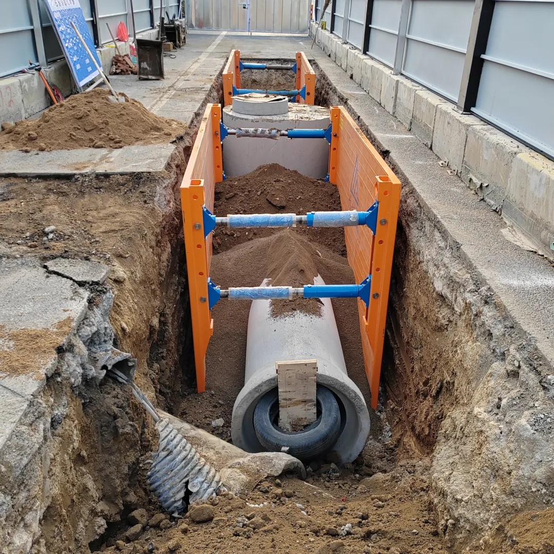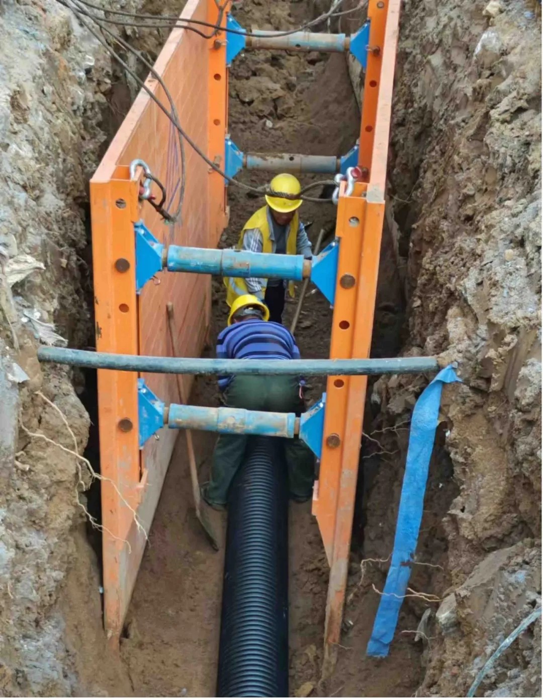 該箱式支護(hù)系統(tǒng)大大降低了管溝槽塌方的風(fēng)險(xiǎn),工人在支護(hù)系統(tǒng)內(nèi)施工安全更有保障。