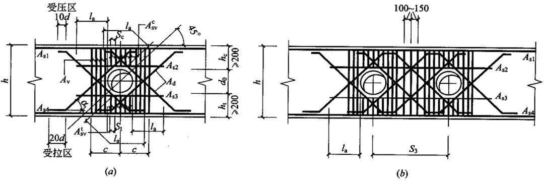 梁上開洞,因?yàn)楦淖兞肆菏芰μ匦?,因此必?/span>采用附加筋補(bǔ)強(qiáng)措施,設(shè)計(jì)進(jìn)行力學(xué)計(jì)算后出具大樣圖,嚴(yán)格依圖施工。某項(xiàng)目水管和風(fēng)管穿梁開洞構(gòu)造示意圖: