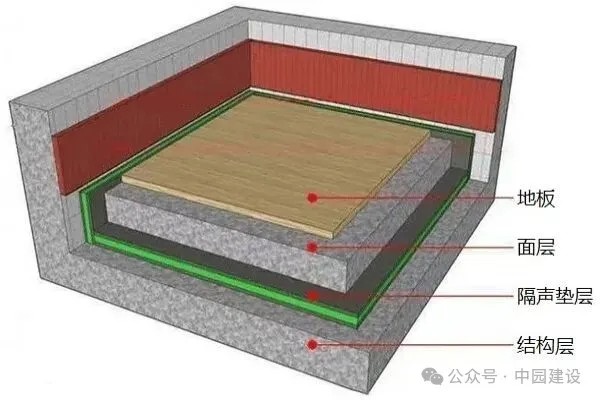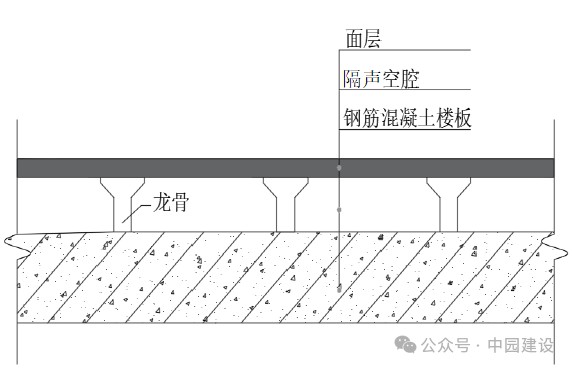 具體而言,浮筑樓板涵蓋了兩種主要的構(gòu)造做法:一種是隔聲空腔浮筑樓板,另一種則是隔聲墊層浮筑樓板。對于隔聲空腔浮筑樓板,其構(gòu)造特點(diǎn)在于利用龍骨進(jìn)行支撐,從而在面層與基層之間形成一個隔聲空腔;而對于隔聲墊層浮筑樓板,則是通過鋪設(shè)具有彈性的隔音減震材料,來形成一層有效的隔聲墊層。