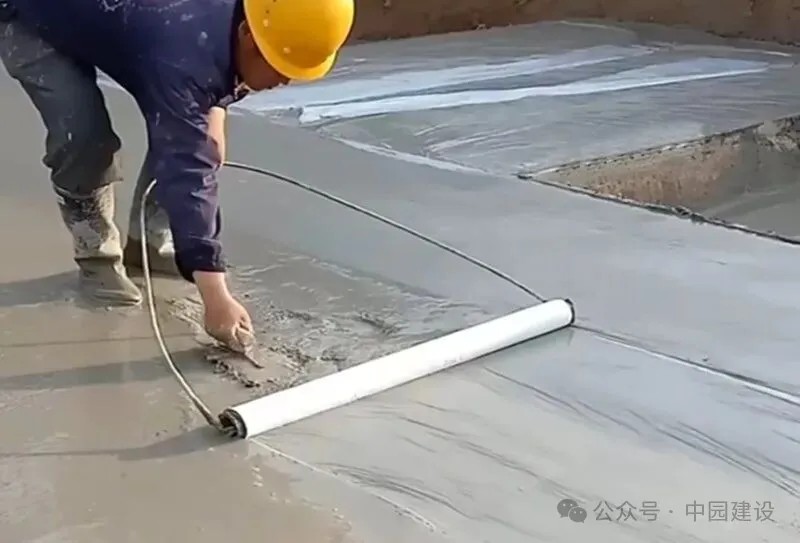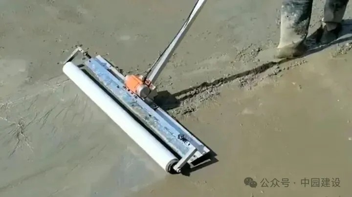 如圖所示,無需額外增添任何設備,僅借助兩根繩子,通過一端拉緊、一端放松的操作方式,工人便能不踩踏混凝土,實現(xiàn)隔空操控覆膜滾軸向前移動并進行攤鋪作業(yè)。這種方法效率頗高,施工質(zhì)量佳,且不會留下任何安全隱患。