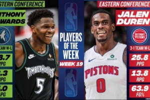 體育資訊3月3日訊 NBA官方公布了25-26賽季第19周東西部周最佳球員,東部活塞中鋒杜倫當(dāng)選,西部是愛(ài)德華茲。
