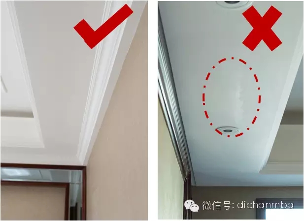 目測: 吊頂乳膠漆有明顯刷紋,不合格。