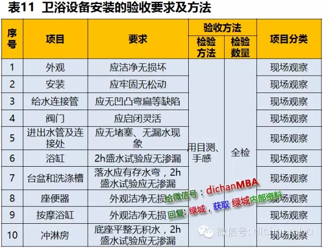 十一.綠城衛(wèi)浴設(shè)備驗收標(biāo)準(zhǔn)解析 衛(wèi)浴驗收基本要求 (1 )衛(wèi)生潔具外觀潔凈無損。衛(wèi)生潔具應(yīng)安裝牢固,無松動。不宜在多孔磚或輕型墻中使用膨脹螺栓固定衛(wèi)生器具。衛(wèi)生潔具的給水連接管,無凹凸彎扁等缺陷。排水、溢水應(yīng)暢通無堵,各連接處應(yīng)密封無滲漏,閥門啟閉靈活。衛(wèi)生潔具與進(jìn)水管、排污口連結(jié)應(yīng)嚴(yán)密,無滲漏現(xiàn)象。坐便器應(yīng)采用膨脹螺栓固定安裝,并用油石灰或硅酮膠連結(jié)密封,底座不得用水泥砂漿固定。浴缸排水必須采用硬管連接(原配管除外),應(yīng)無滲漏。 (2 )按摩浴缸的電源必須用插座連接,嚴(yán)禁直接接電源,電機(jī)試機(jī)必須先放水后開機(jī),連接處應(yīng)無滲漏。 (3 )沖淋房底座應(yīng)填實,底座安裝平整無積水,排水管應(yīng)采用硬質(zhì)管連接,沖淋房的玻璃采用安全玻璃,沖淋房與墻體結(jié)合部應(yīng)無滲漏現(xiàn)象。 (4 )安裝完畢后進(jìn)行2h盛水試驗應(yīng)無滲漏。盛水量分別如下:便器高低水箱應(yīng)盛至扳手孔以下10mm處;各種臺盆和洗滌槽應(yīng)盛至溢水口;浴缸應(yīng)盛至缸深的三分之一;浴缸溢水口應(yīng)作灌水試驗;水盤應(yīng)盛至盤深的三分之二。 驗收要求及方法 衛(wèi)浴設(shè)備安裝的驗收要求及方法應(yīng)按表“表12”的規(guī)定進(jìn)行。