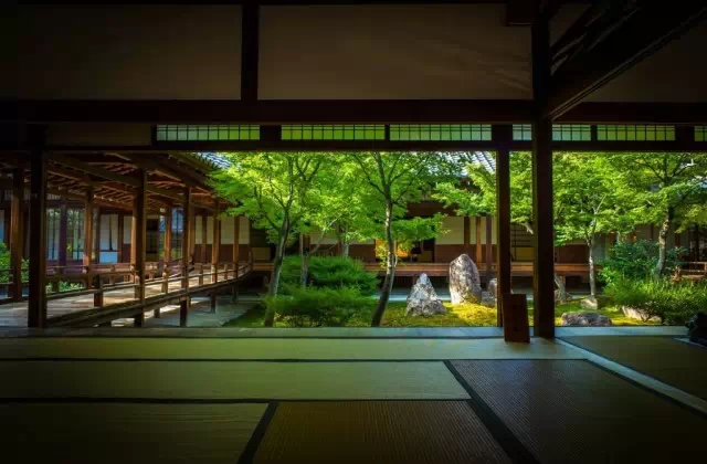 回字型的主入口藏在一條與古寺一墻之隔的悠長石徑盡頭、由巨幅落地窗包裹的大堂和客房都朝向落英繽紛的水景庭院。