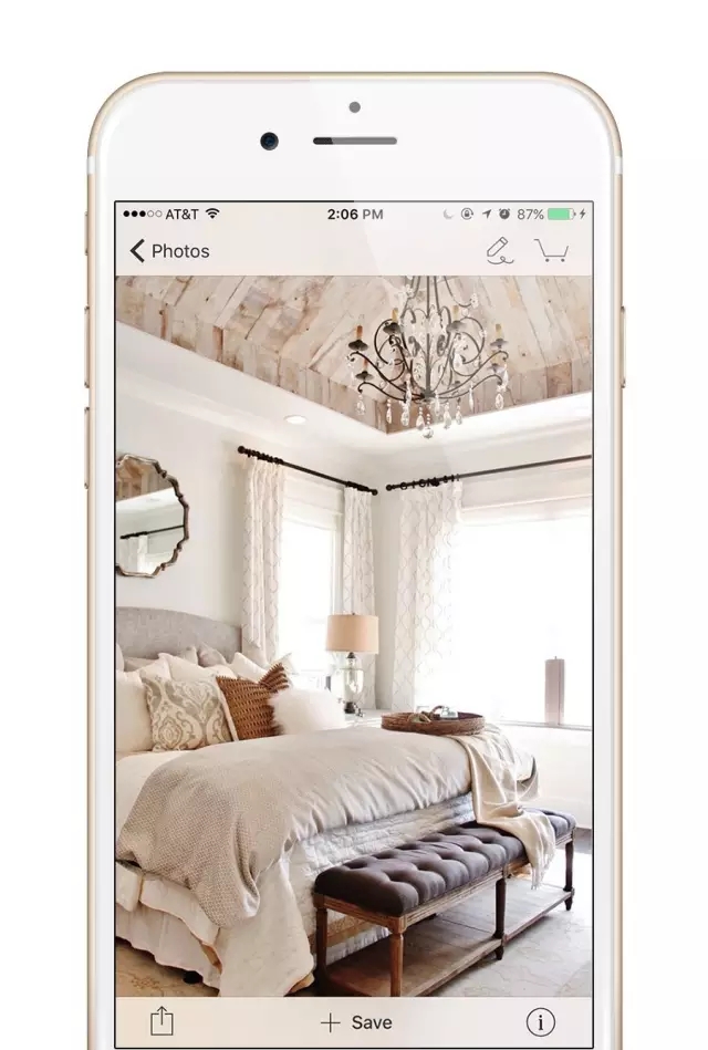點擊你喜歡的案例圖,同樣的,你可以點擊左下角的按鈕分享給別人;可以點擊“save”保存到自己的收藏夾;點擊右下角的“i”按鈕,查看這個案例設計師的信息;點擊右上角的鉛筆按鈕,對圖片加文字、標尺寸、加家具等等。