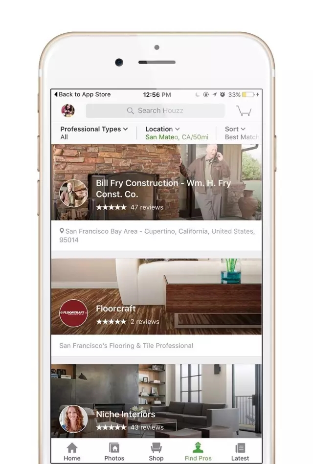 Houzz的社區(qū)屬性體現(xiàn)在幫你對接優(yōu)秀設計師上。在“Find Pros”一欄中,你可以看到你周邊的設計師們,比如第一個有47個評價的五星老爺爺設計師~