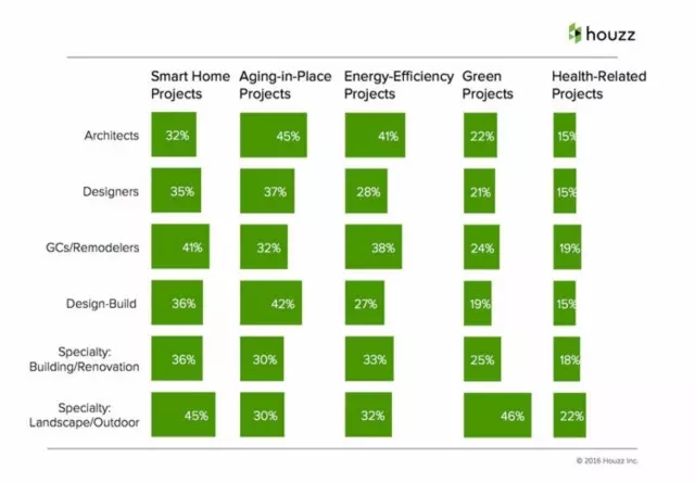根據(jù)他們的數(shù)據(jù),廚房和衛(wèi)生間的家裝項目增長明顯,而且人們對于智能家居項目以及與適配老年人生活的項目要多于其他項目(節(jié)能設備項目、環(huán)保項目、健康相關項目)。