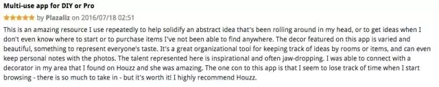 “這是一個非常棒的軟件,我用它幫助我實現(xiàn)我腦海里的抽象的想法。當我不知道從哪開始或者購買我之前在哪都找不到的東西時,它會幫我找到一個想法。這個APP的裝飾很漂亮,有些東西可以很好地符合大眾口味。這是一個很好的以你想法并通過不斷追蹤你房間或者物品來安置物品的工具,并且可以保存用戶筆記的照片。這里比較驚艷的是具有啟發(fā)性或者往往讓你驚掉下巴的想法。 我曾經(jīng)給一位室內裝修的設計師看我在Houzz上的一塊區(qū)域后,她表示很驚訝。每當我開始瀏覽這個軟件的時候我總會忘記時間。很多東西可以說,我極力推薦Houzz?!?/p>