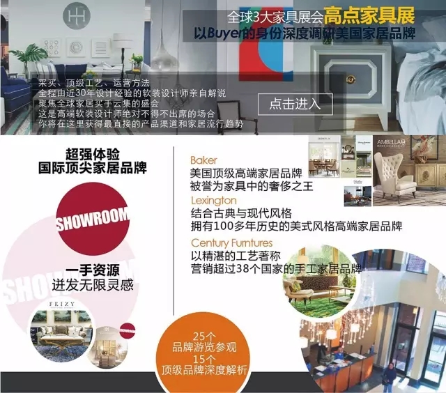 高點(diǎn)之所以是任何家居從業(yè)者的理想圣地,源于它總為參展者提供最前沿的家居流行趨勢,更可以搶先在下一季潮流來臨之前捕捉靈感。本次展會有25家世界最頂級家居品牌參加,包括Baker, Caracole, Century,Harden, French Heritage, Global Views, Feizy, Scarborough House,John-Richard,American Leather, Currey, HickoryWhite, Lillian August, Trowbridge, Lexington等。