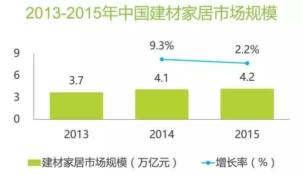 2015年我國建材家居市場規(guī)模達(dá)4.2萬億元。該行業(yè)互聯(lián)網(wǎng)滲透率僅為4.0%,有較高的增長空間,預(yù)計(jì)互聯(lián)網(wǎng)家裝會(huì)繼續(xù)保持增長態(tài)勢(shì)。