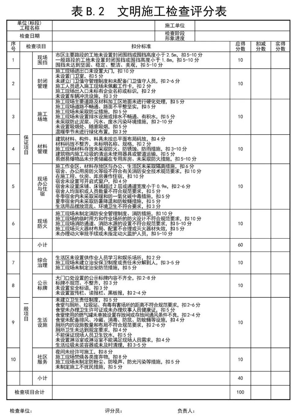 實際上,“文明施工”并不是泛泛而談,而是有這明確的10大項56小項內(nèi)容。基于JGJ59《建筑施工安全檢查標準》,以及GB50720《建設(shè)工程施工現(xiàn)場消防安全技術(shù)規(guī)范》和JGJ146《建筑施工現(xiàn)場環(huán)境與衛(wèi)生標準》、JGJ/T188《施工現(xiàn)場臨時建筑物技術(shù)規(guī)范》的規(guī)定,文明施工檢查評定包括6大項保證項目以及4大項一般項目,共56小項內(nèi)容??偨Y(jié)如下: