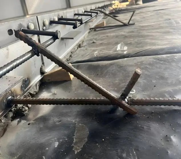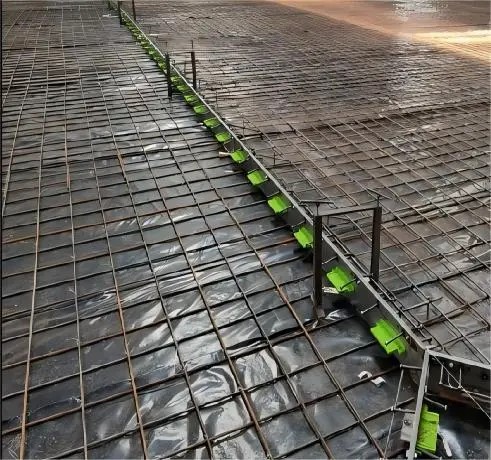 鋼筋綁扎應(yīng)在0.3厚的PE防潮膜施工完成后與金屬鎧裝縫安裝同步施工,并與安裝固定好的金屬鎧裝縫焊接一體。
