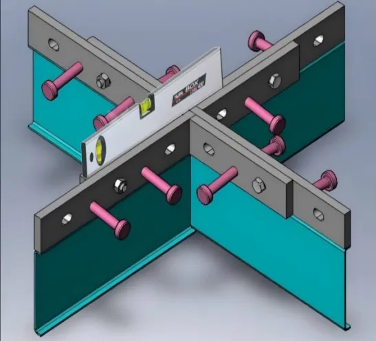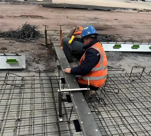 金屬鎧裝縫放置就位后,分段施工,可調(diào)節(jié)裝置由金屬鎧裝縫的兩側(cè)套入,每段金屬鎧裝縫的套入數(shù)量在3-4個(gè),安裝完成后用水平尺進(jìn)行平整度檢測(cè)。