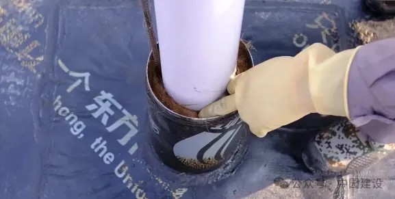 套管與出屋面管道之間的縫隙用浸油瀝青麻絲捻成長條狀,細(xì)鏟填塞密實,選用專用密封膠或瀝青油膏等有一定收縮性的材料進(jìn)行封口。