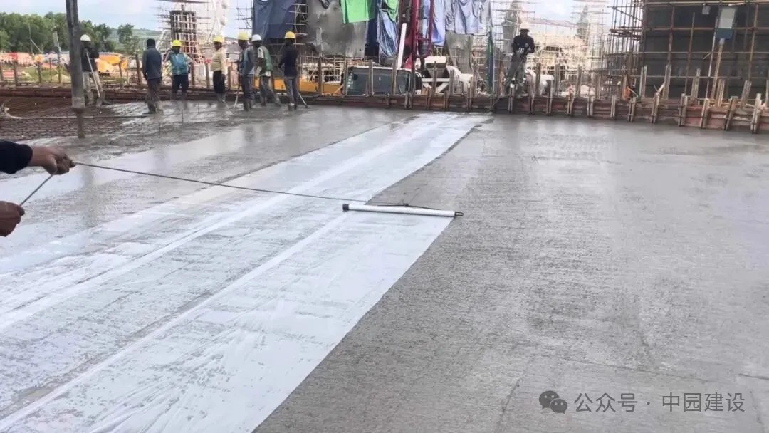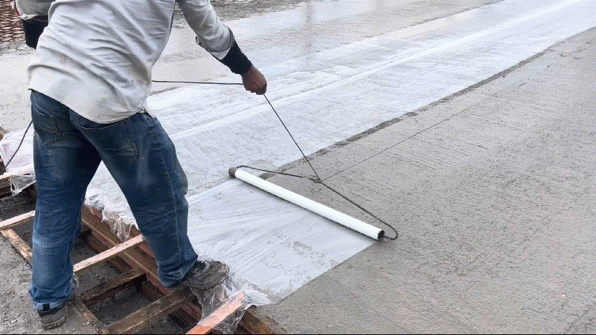 如圖所示,無需額外增添任何設備,僅借助兩根繩子,通過一端拉緊、一端放松的操作方式,工人便能不踩踏混凝土,實現(xiàn)隔空操控覆膜滾軸向前移動并進行攤鋪作業(yè)。這種方法效率頗高,施工質(zhì)量佳,且不會留下任何安全隱患。