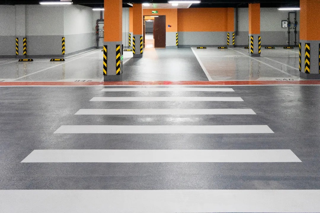 對于環(huán)氧地坪的地面打滑問題,可以在車行道區(qū)域作表面橘皮止滑處理,以增加摩擦力,減少打滑現(xiàn)象。